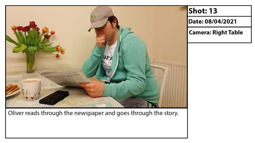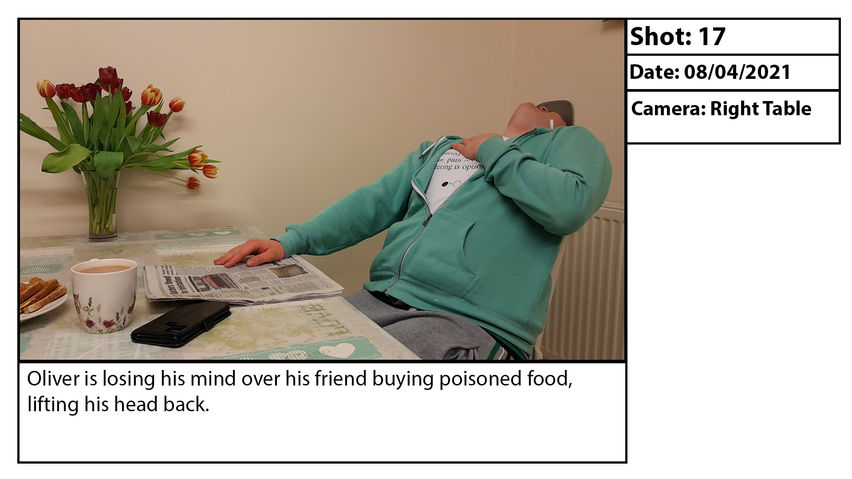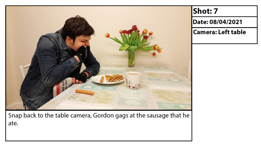 The premise of this Storyboard is that the man in the denim jacket and gloves (Nicknamed Gordon) is having sausage and toast with tea. He reads the newspaper only to realise that something written on the papers caused him to gag and throw out the bitten sausage. Then, another character wearing a hat and green jacket (Nicknamed Oliver) has entered the room wondering why Gordon is acting up. He passes the newspaper to Oliver and as he reads it, he notices that the sausages that he bought could've been related to the news about rat droppings in a Butcher's shop.