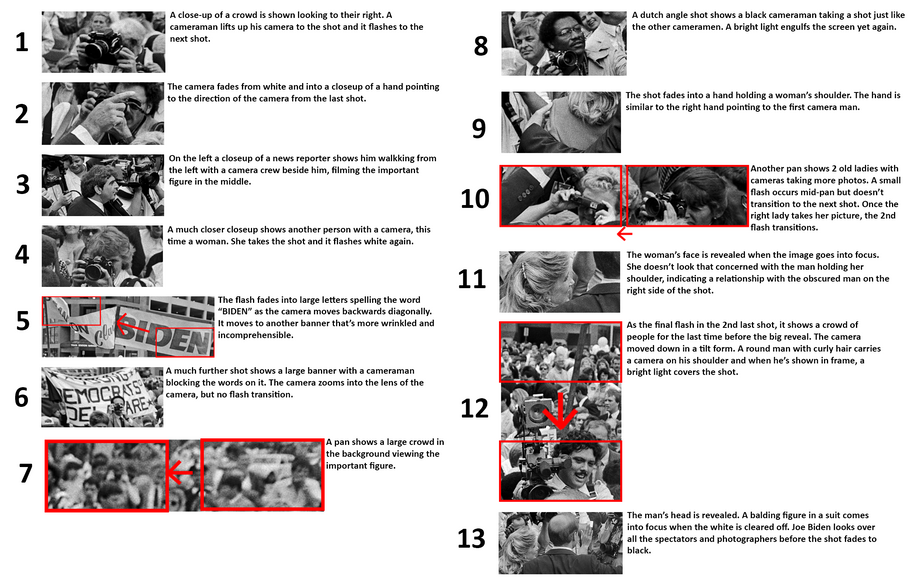 Of all the historical photographs I was given, I went with a Joe Biden photograph from the 20th century before the Ketamine addicted Abe Simpson became president. So my whole deal was to make 12 shots by chopping up the picture into it's own bits. Further on, I'll be drawing squares and arrows indicating camera movement and such.